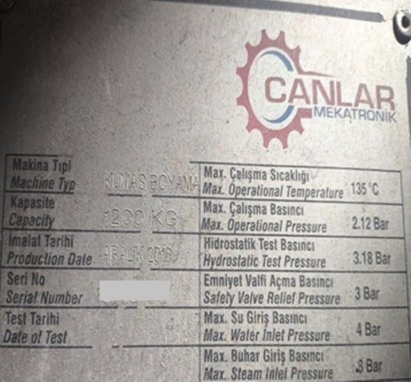 Canlar HT Kumaş Boya Makinesi, 1200 kg , 2016 model