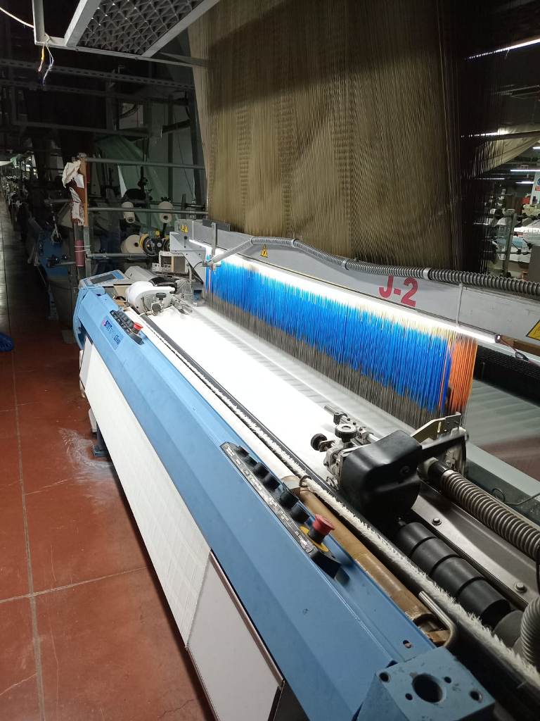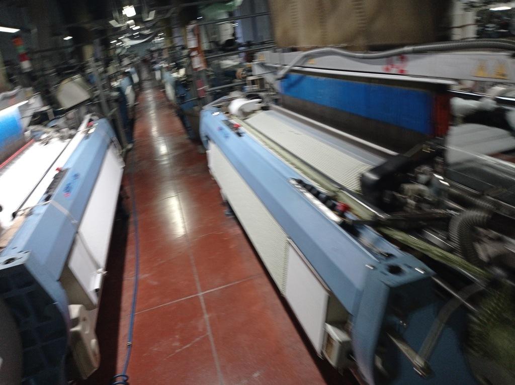 6 pcs SMIT GS900 Brand Jacquard Weaving Machine, 220 cm width, 2007 model, Bonas ZJ jacquard, 2007 model, 2688 hooks, 4 weft feeding, 1.5 warp beam, 1.5 fabric beam, installed and running situation