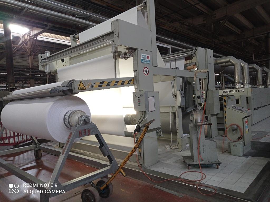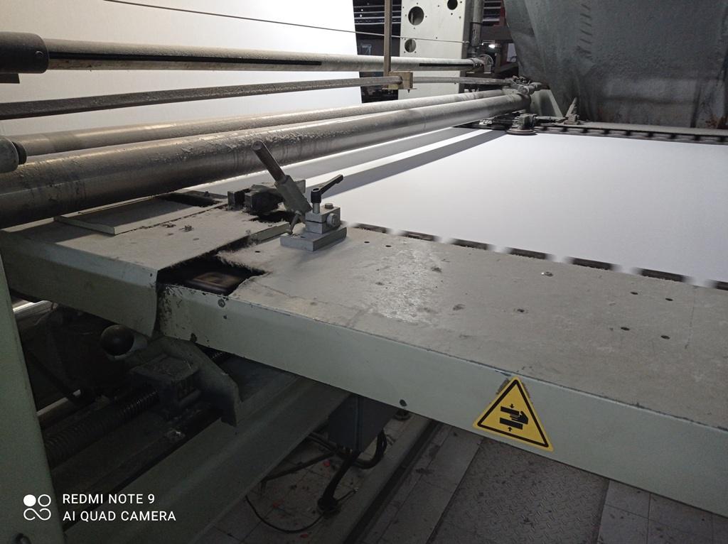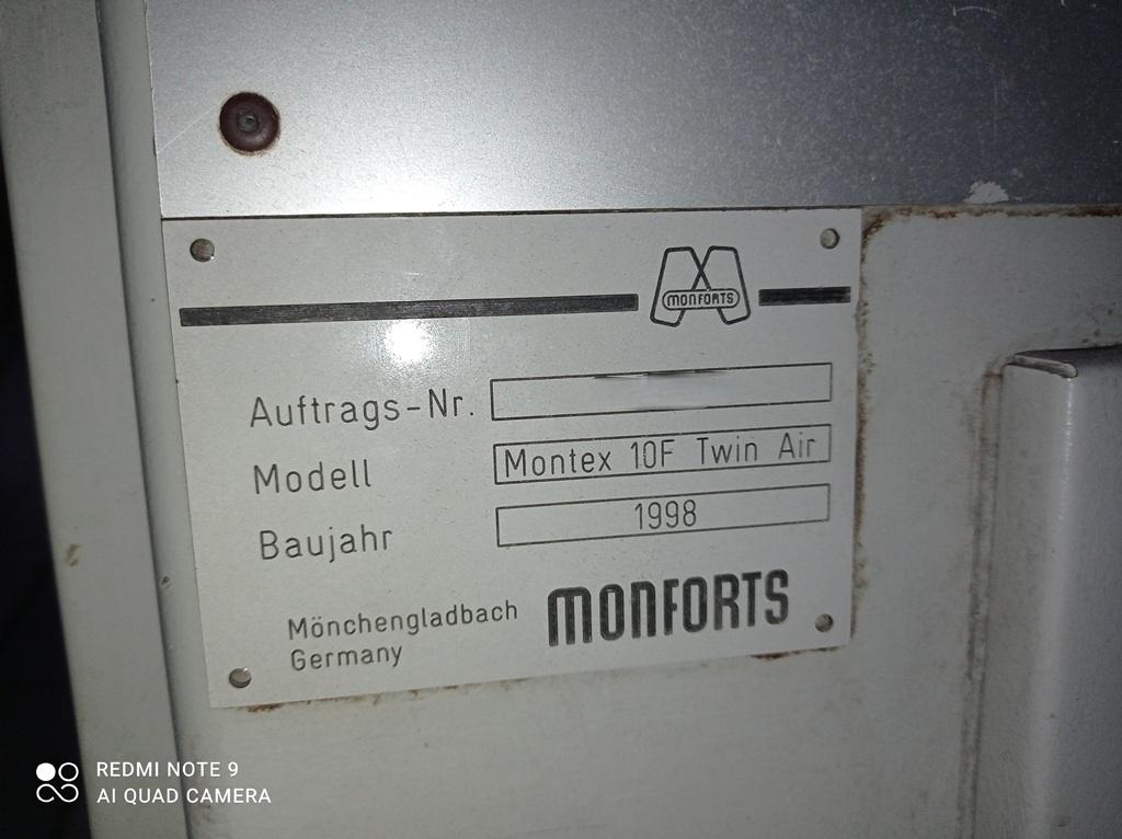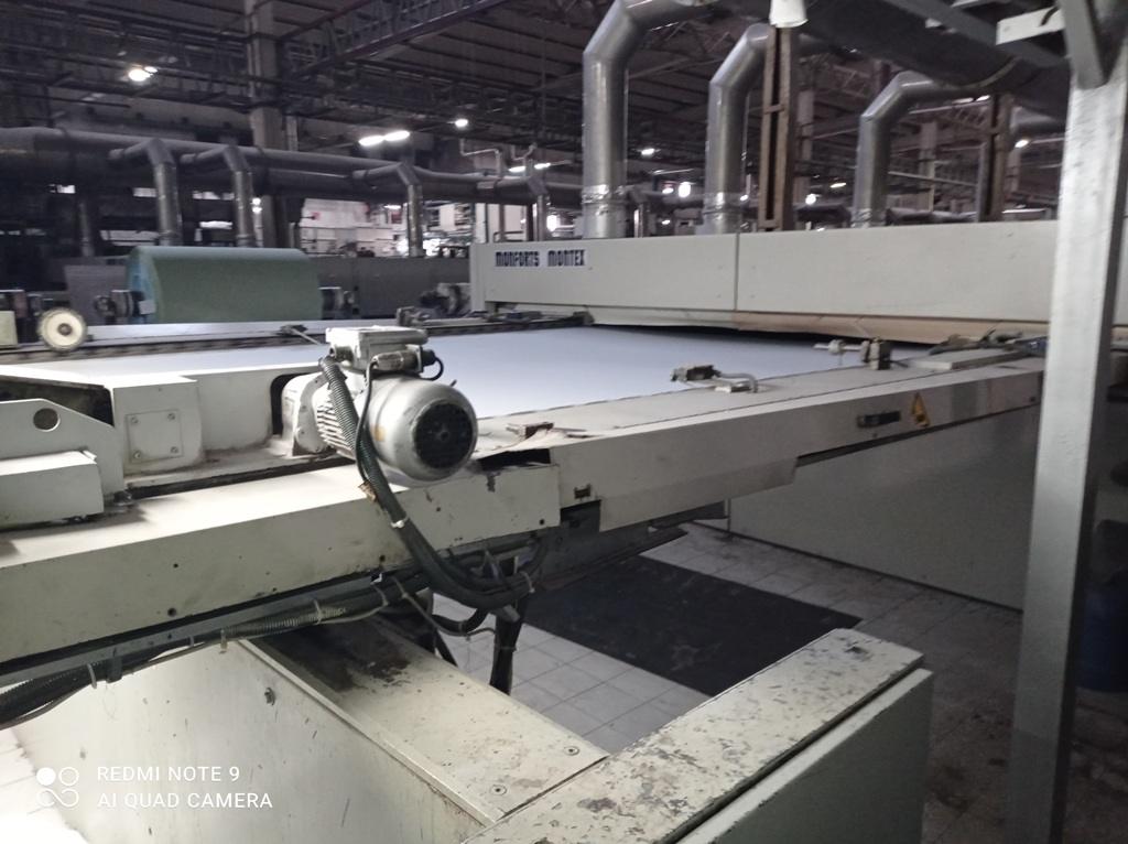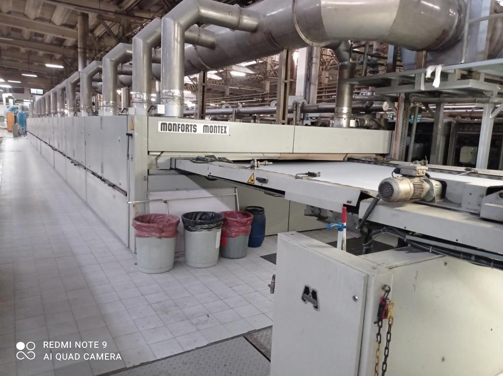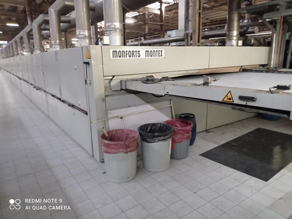 Monforts Montex Brand Stenter Machine, 280 cm working width, 1998 model, 10 chamber, steam heated, horizontal chain, pin, at the entry; batcher, J-box, fabric opener, padder, Mahlo weft straightener, at the exit; J-box, batcher, installed and running situation