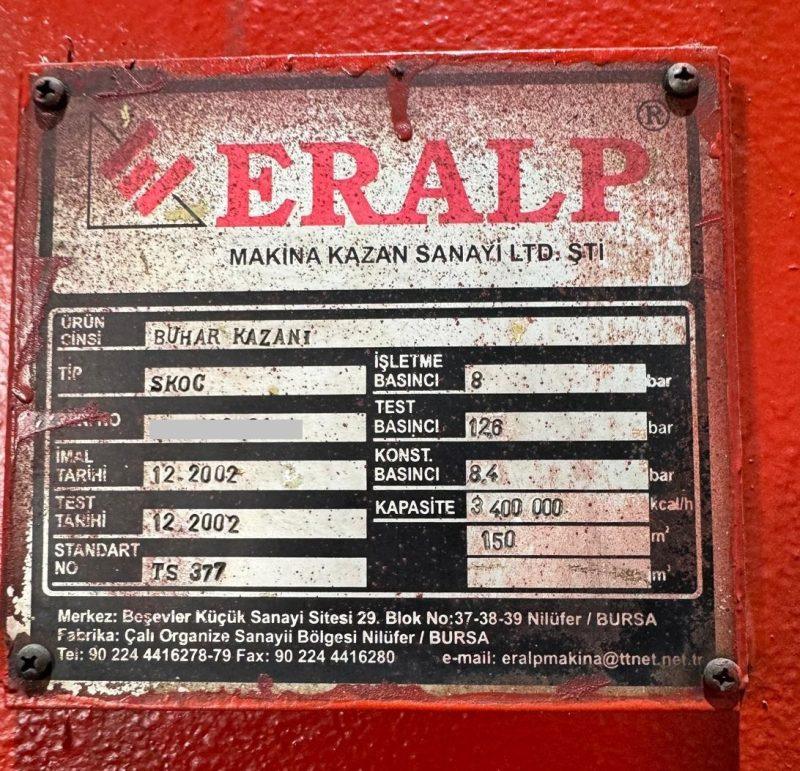 Eralp Marka Skoç Buhar Kazanı, 2002 model, 5 ton/saat (3.4 Milyon Kcal/saat), 150 m2, kurulu ve çalışır durumda