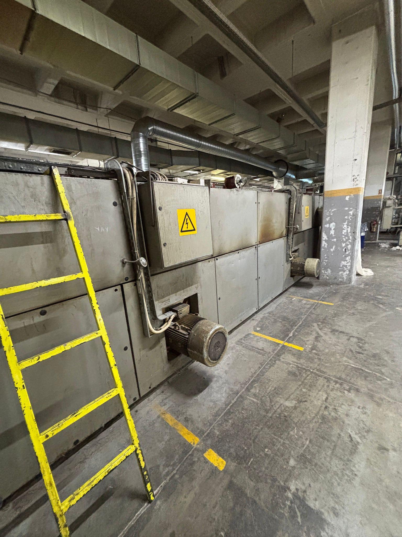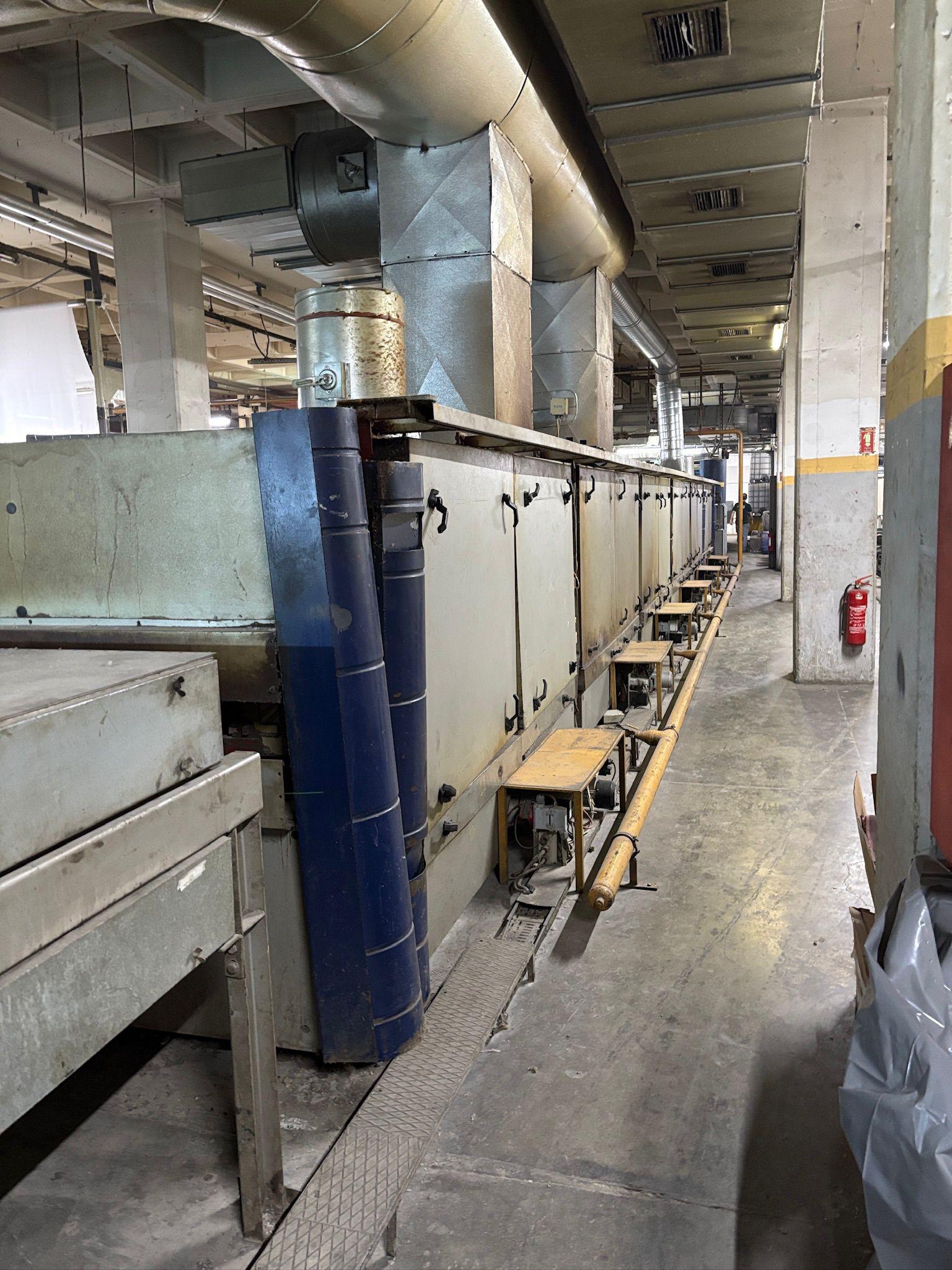 Babcock Marka Ram Makinası, 180 cm çalışma eninde, 1999 model, 6 kamara, doğalgazlı, yatay zincir, iğne, kumaş açıcı, Erhardt+Leimer atkı düzenleme, doka sarma, sallama, kurulu ve çalışır vaziyette.
