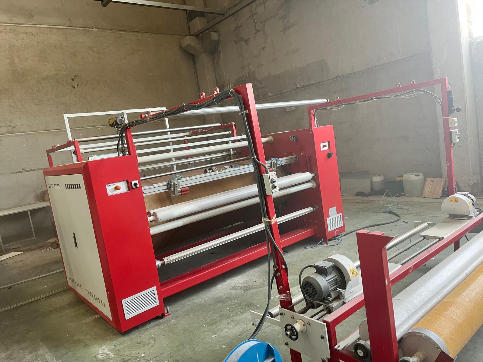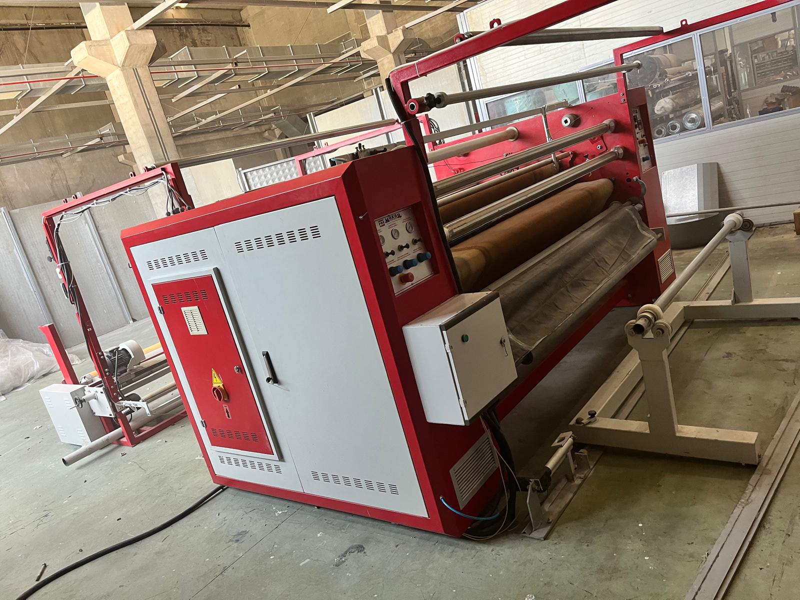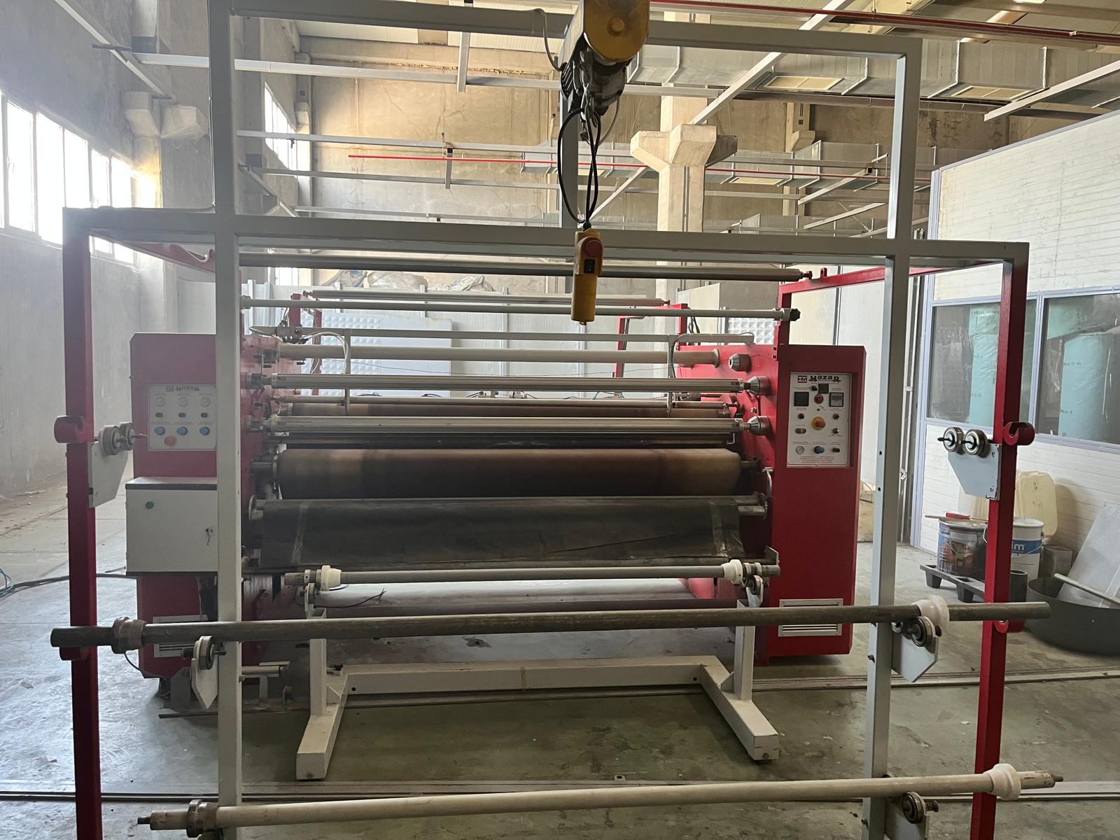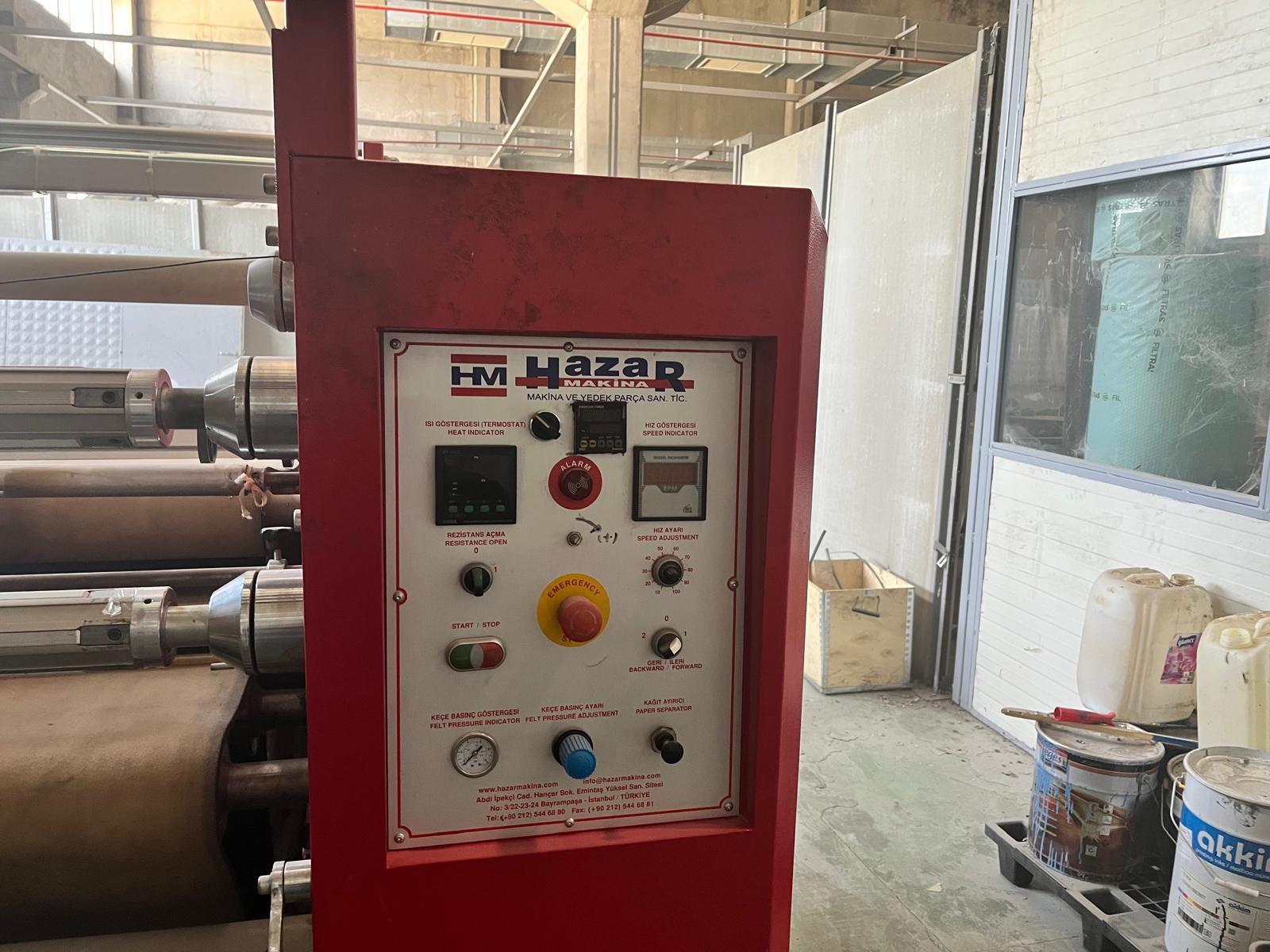 Hazar Makina Marka Keçeli Transfer Baskı ve Kumaş Laminasyon Makinası, 2016 model, 2.30 mt eninde, çıkışta doka sarma ünitesi ile birlikte, kurulu ve çalışır durumda.