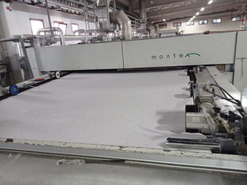 Monforts Montex Ram Makinası, 300 cm çalışma genişliği, 2004 model, 10 kamara, buharlı, yatay zincir, iğne, girişte: doka sarma, kumaş açıcı, J-box, fular, Mahlo atkı düzenleme, çıkışta: J-box, doka sarma, invörtör, buharlı, kurulu ve çalışır durumda.